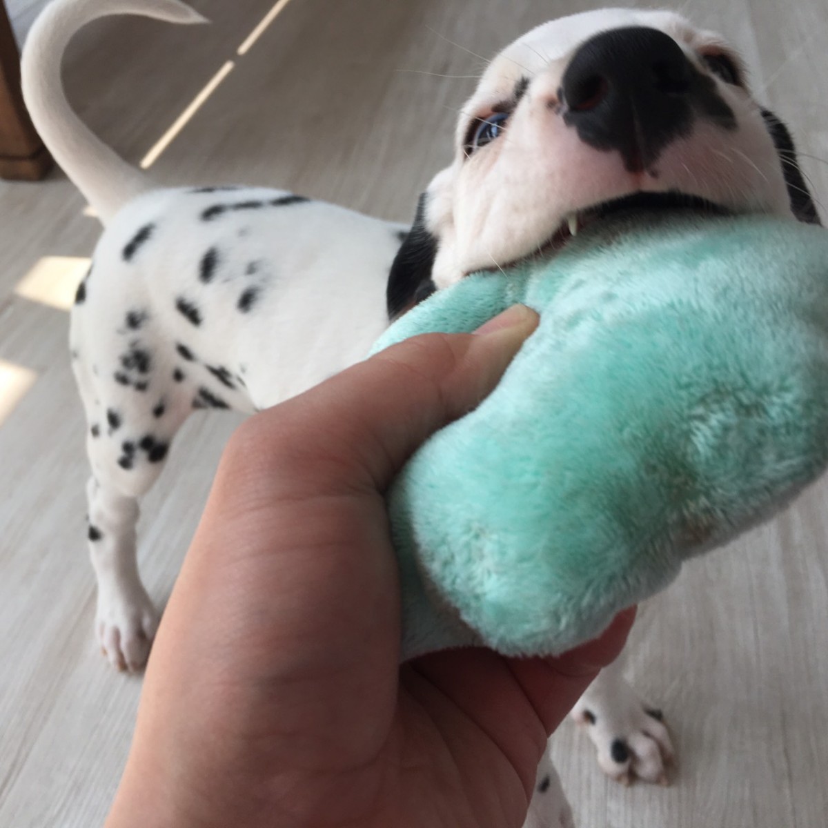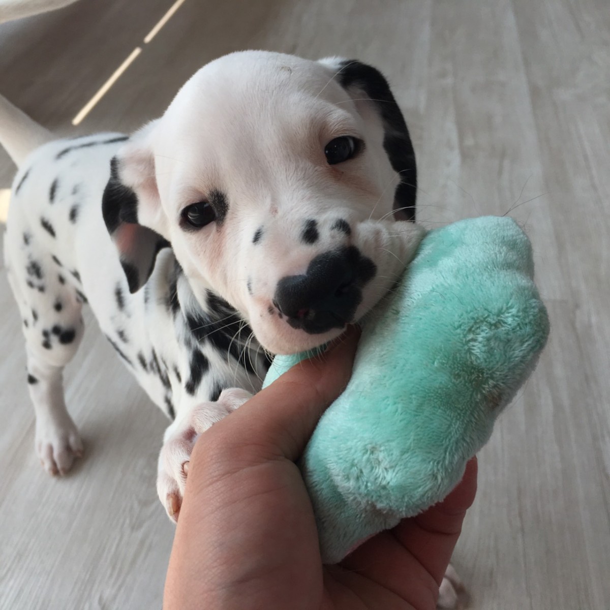 白い体に黒の斑点が特徴のわんちゃんです(^^♪