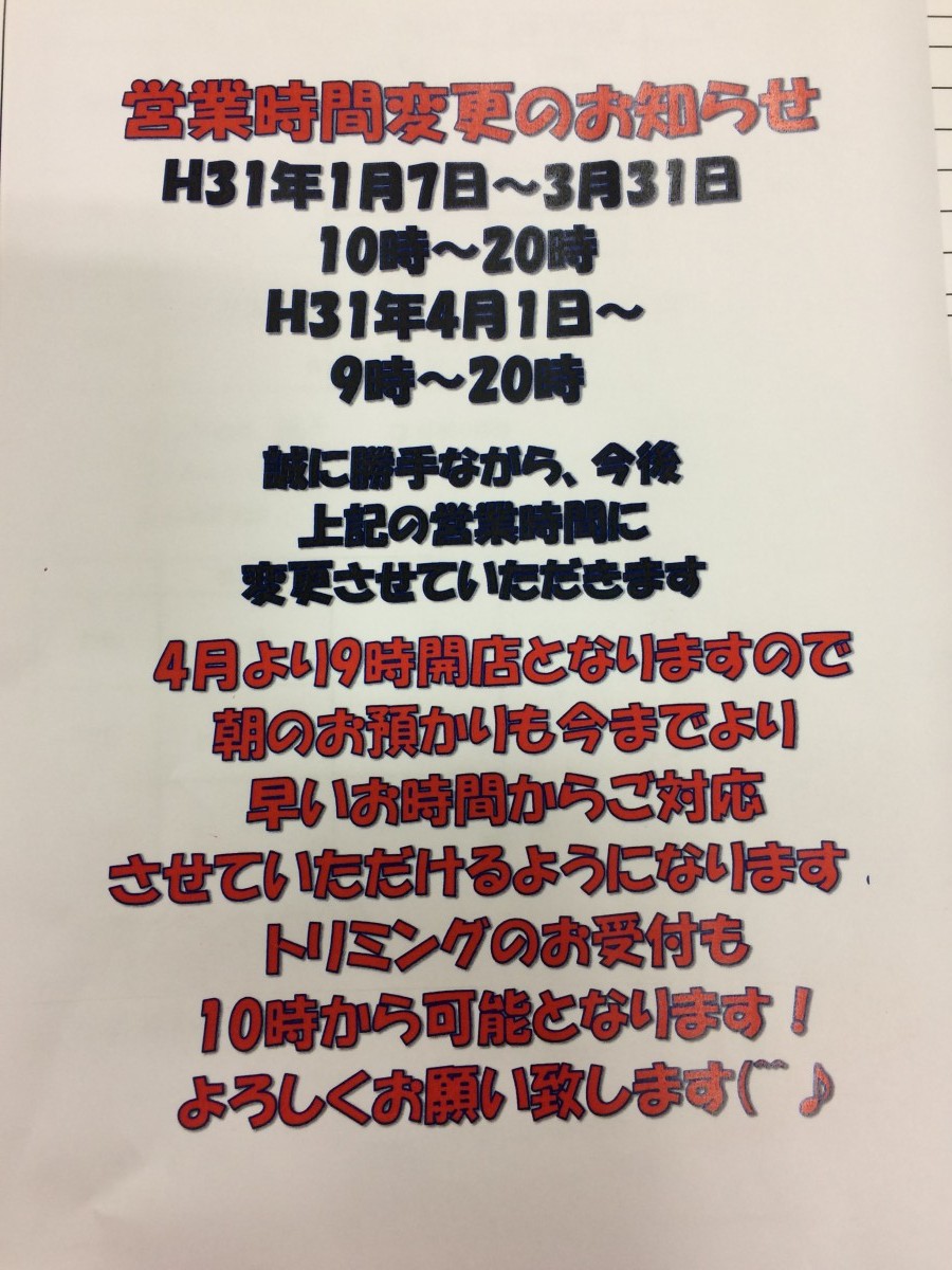 H31年4月からは9時開店となりますので朝のお預かりのお時間も9時から可能となります。