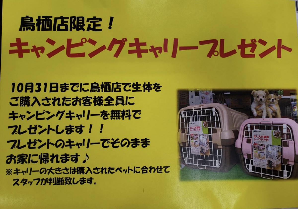 10月31日までに『鳥栖店』で生体を購入されたお客様全員に、キャンピングキャリーを無料でお渡ししております(≧▽≦)