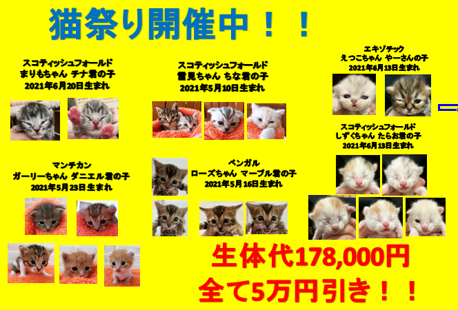 現在店舗にいる子たちに加えて、7月~8月にデビュー予定のスコティッシュ、マンチカン