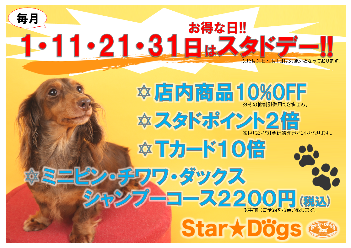 毎月1のつく日は(1,11,21,31)はスタドデー!