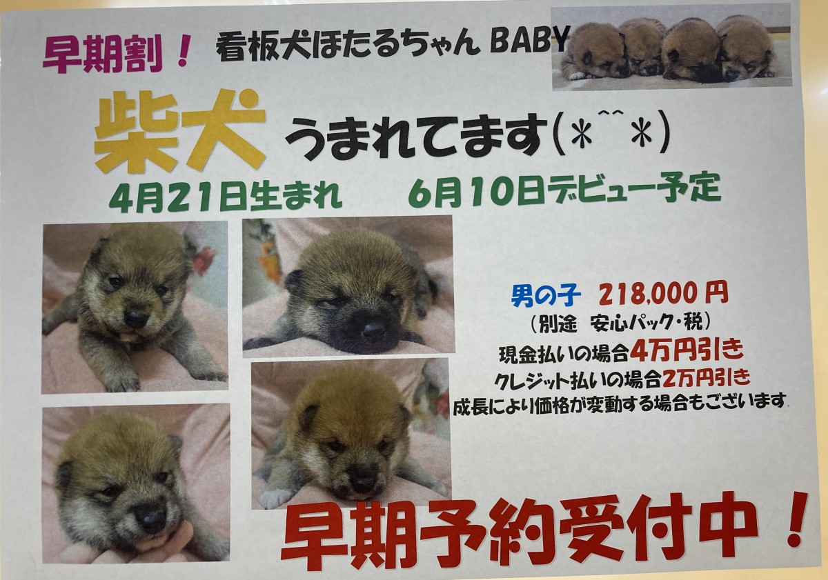 看板犬の柴犬ほたるちゃんが先日出産し、男の子4兄弟が産まれました!!