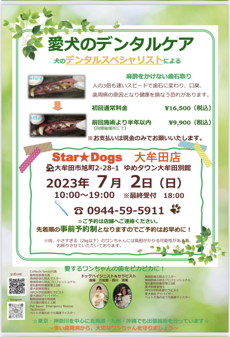 ワンちゃんの無麻酔歯石除去のお知らせです!