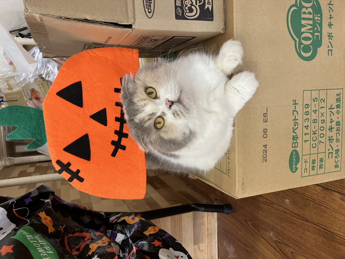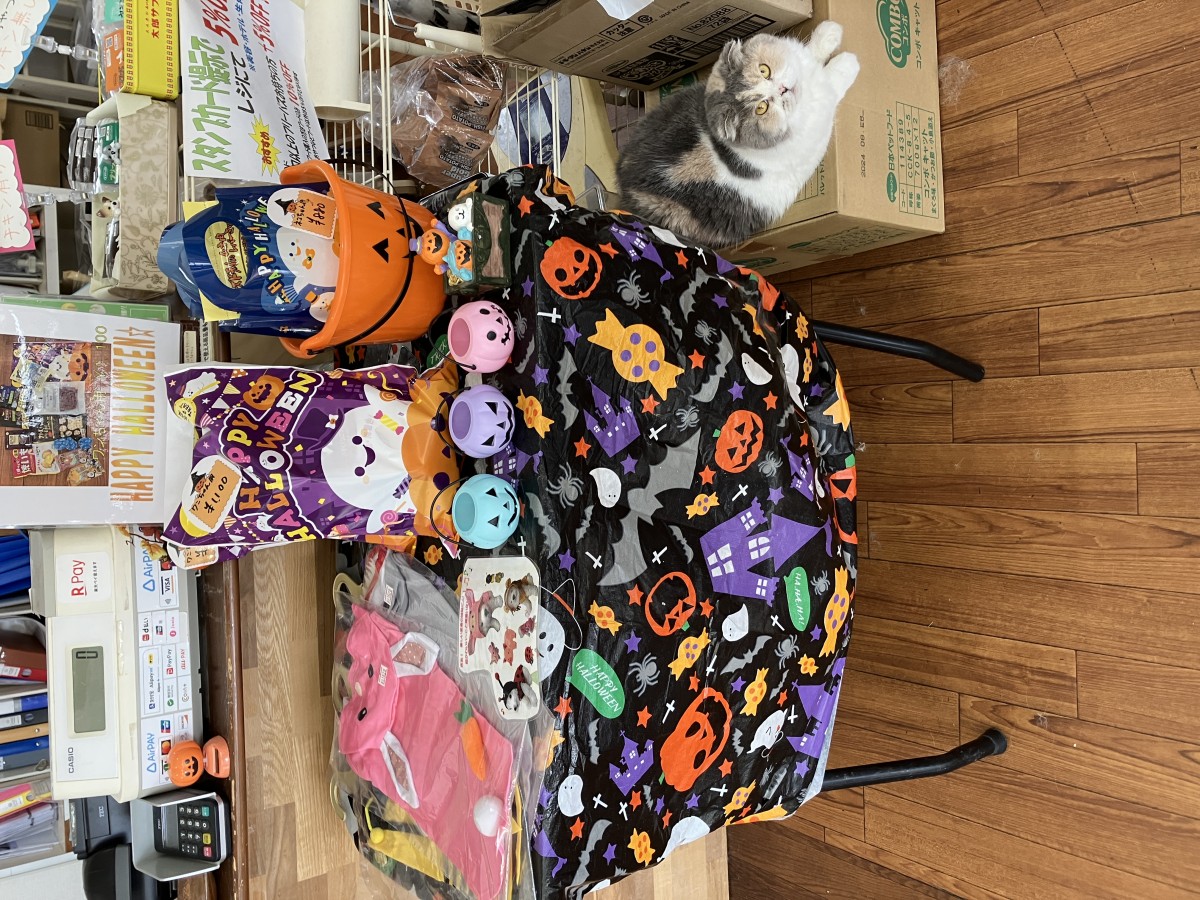 看板猫のシフォンちゃんもカボチャを頭に乗せて皆様のご来店お待ちしております(‘ω’)ノ