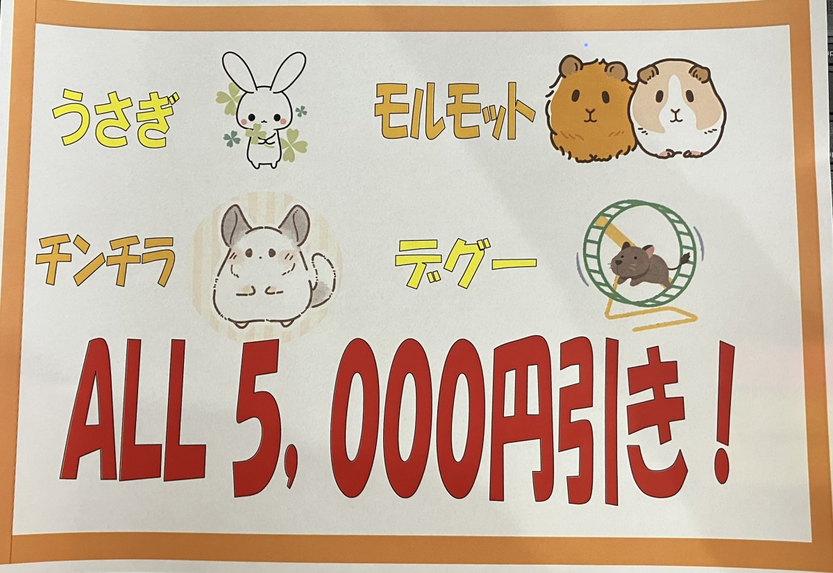 ☆うさぎ・モルモット・チンチラ・デグー各種5,000円引き!