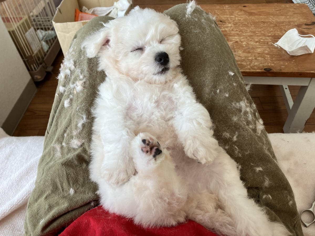 まだ小さな仔犬ちゃんなので、お膝のうえでカットしていたのですが・・・・