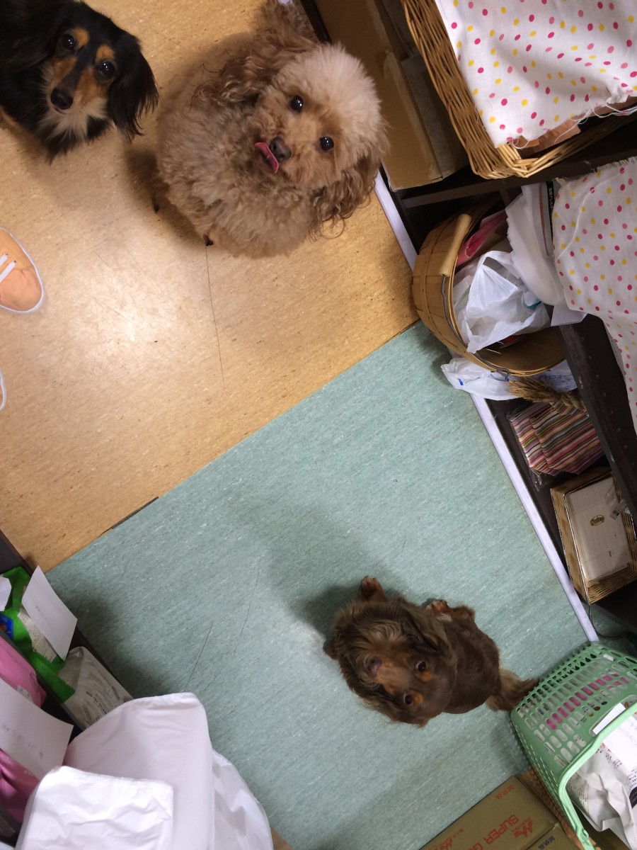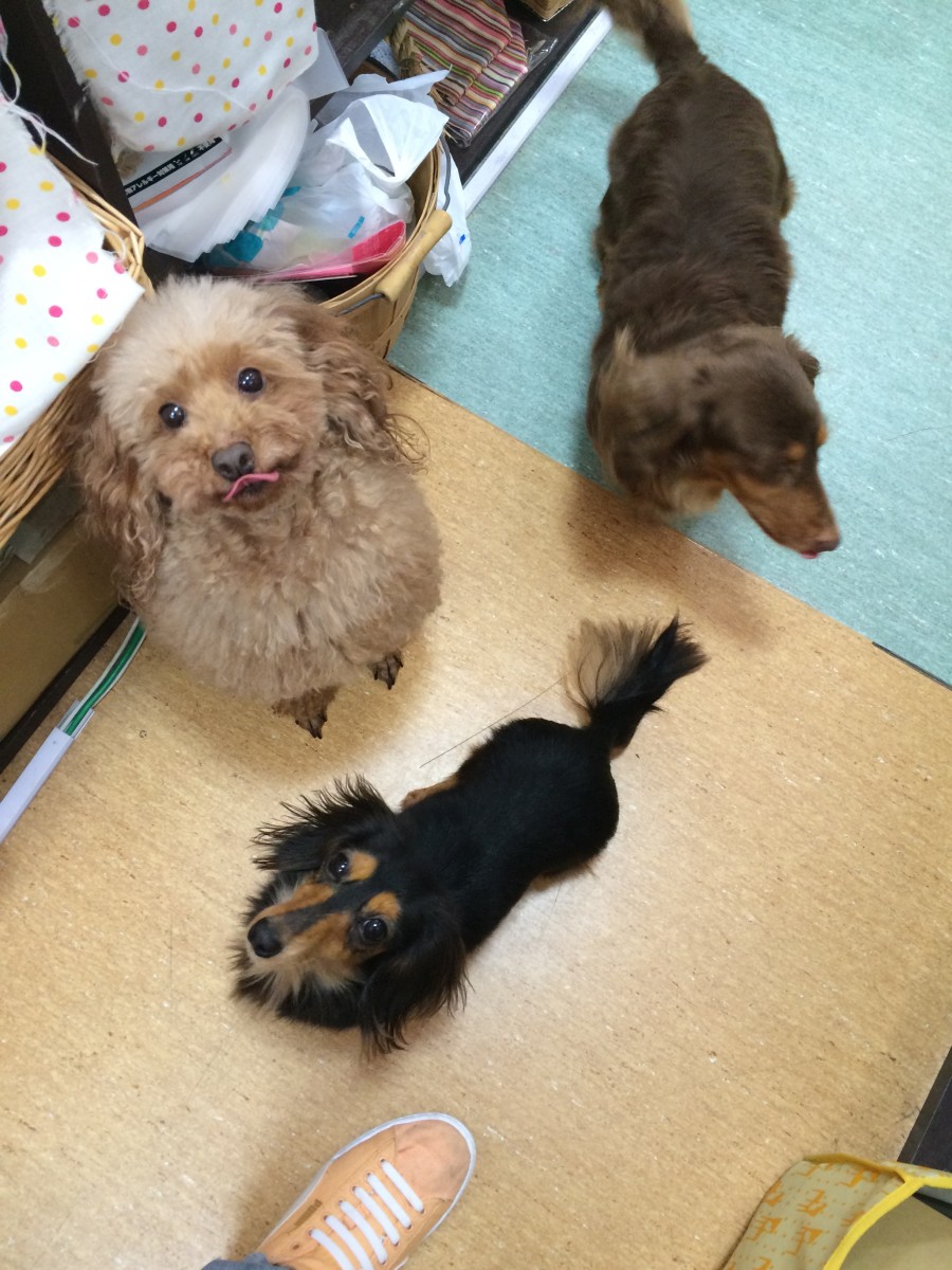 店内に看板犬3匹出して3匹同時にお座りをさせてみました☆