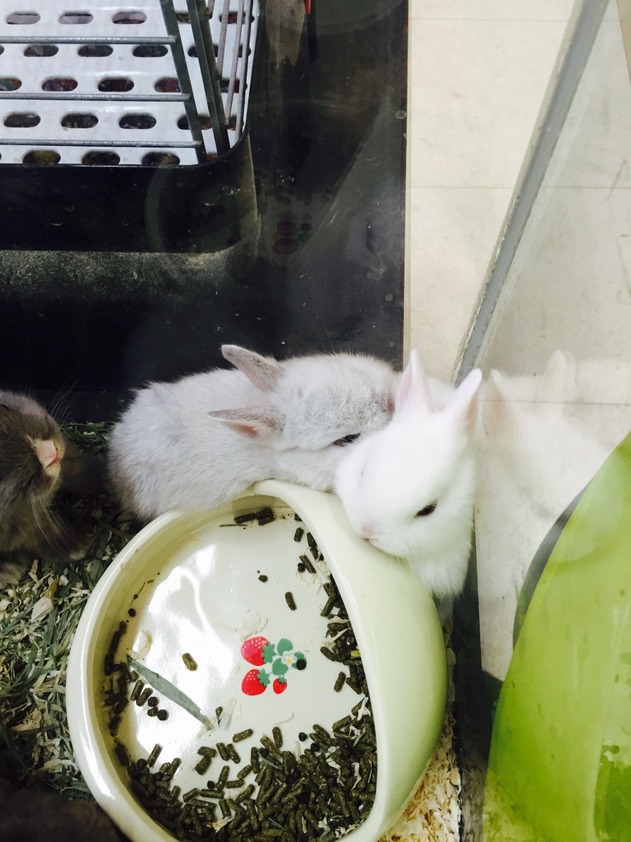 新しく入ったウサギはご飯の周りでギュウギュウで寝ていたり