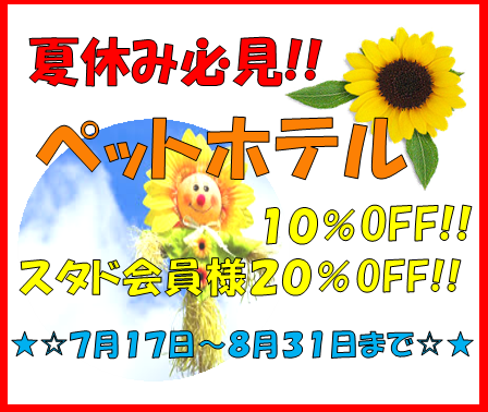 本日7月17日から8月31日まで、ペットホテルを10%OFFさせていただきます。