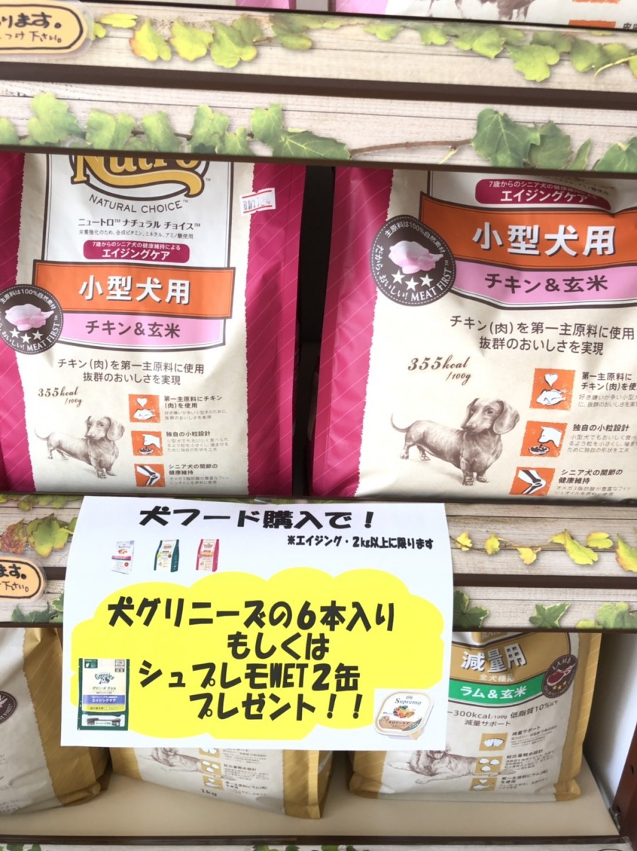 熊本店では、ワンちゃんフード購入でウエットもしくはグリニーズをプレゼント中です!